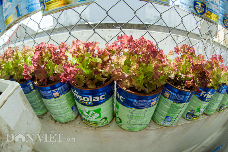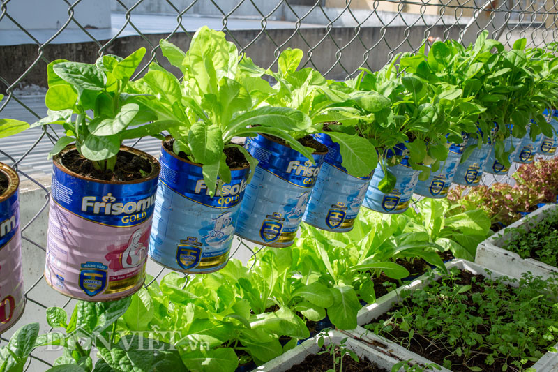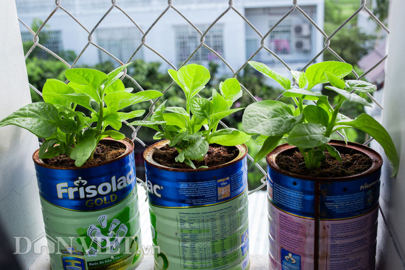 Với điều kiện chật hẹp nhà không có vườn thì việc có những mớ rau xanh tự trồng là cả một vấn đề. Vì vậy, với số diện tích ít ỏi 4m2, anh Biển đã lên mạng tham khảo nhiều diễn đàn về trồng cây ở các nước và sử dụng chính những chiếc vỏ hộp sữa của cậu con trai để "chế" ra kiểu trồng rau sáng tạo cho vườn chật nhà mình.