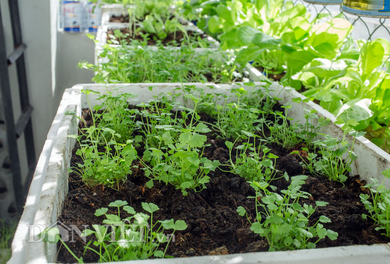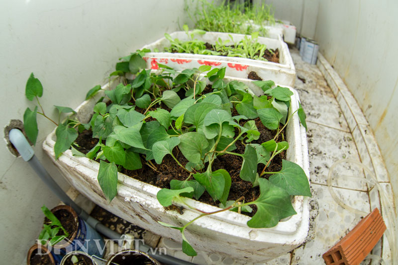 Lúc đầu trồng việc khó khăn nhất là bố trí như thế nào để được thật nhiều chậu, thùng xốp trong không gian khá hẹp chỉ với gần 1m chiều rộng và 4m chiều dài.
