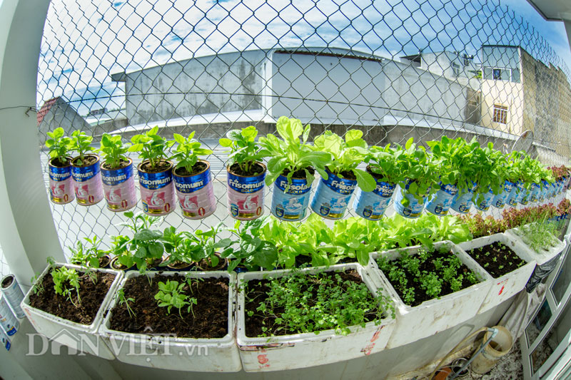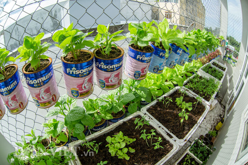 Khu vườn 4m2 có tổng số 60 vỏ hộp sữa và 12 thùng xốp.