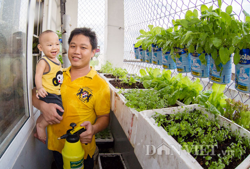 Tâm sự với PV Dân Việt, ông bố trẻ 9X một con này chia sẻ, trước đây anh Biển vốn không có ý định trồng rau sạch tại nhà. Thế nhưng, từ ngày cậu con trai chưa đầy 1 tuổi của anh bắt đầu ăn dặm, lại thêm lo lắng trước thực trạng rau phun thuốc kích thích, không an toàn đang tràn ngập trên thị trường, anh Biển đã bắt đầu xắn tay áo vào công cuộc trồng rau sạch.