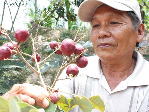 1 triệu đồng mỗi cây giống Lần đầu tiên, trái nhãn tím hiếm hoi xuất hiện tại lễ hội Trái ngon lần thứ 13 tổ chức tại huyện Chợ Lách (Bến Tre), và sau đó ra mắt tại ngày hội Sông nước miệt vườn tổ chức tại tỉnh Sóc Trăng hồi tuần trước. Trái nhãn lạ mắt đã thu hút sự hiếu kỳ của nhiều người và do có số lượng ít đã khiến giá bán sỉ lên tới 80.000 đồng/kg, giá bán lẻ: 2.000 đồng/trái… cũng bị “cháy” hàng ngay những giờ đầu tiên trưng bày tại mỗi nơi. Trong khi đó, giá bán nhãn long bình thường, dù cùng giống, chỉ khoảng 12.000 – 13.000 đồng/kg, nhưng lại được ít người quan tâm. Ông Trần Văn Huy (Bảy Huy), chủ nhà vườn ở ấp Phong Thạnh (xã Phong Nẫm, Kế Sách, Sóc Trăng) hiện đang sở hữu giống nhãn lạ mắt này. “Sau các kỳ lễ hội nêu trên, đã có người đề xuất hợp đồng độc quyền bao tiêu toàn bộ cây nhãn giống của tui với giá 1 triệu đồng mỗi cây, nhưng tui chưa tính toán được có nên hay không giữa lúc này”, ông Bảy Huy nói. Theo ông Huy, trước đây cũng có người từng đặt mua ông Huy mười nhánh nhãn tím với giá 1,5 triệu đồng/nhánh, nhưng ông Huy từ chối vì số lượng đặt mua không đáng kể, trong lúc ông muốn giữ nguyên tính độc đáo của giống nhãn độc quyền này. Trước sự việc cây nhãn tím ra đời, ông Nguyễn Minh Cảnh, phó chủ tịch UBND xã Phong Nẫm, nói: “Ngành nông nghiệp huyện Kế Sách đang tính tới phương án hỗ trợ ông Huy đăng ký độc quyền đối với giống nhãn lạ này, trước khi tính tới chuyện bán giống”. Xuất hiện tình cờ Cách nay mười năm, trong vườn nhãn chuyên canh rộng cả ba công đất (3.000m2) của ông Bảy Huy, chỉ có một cây đơm ra một tược có vài hiện tượng khác thường. Ông Bảy Huy kể: “Lúc đó, phần đọt non có màu đỏ hồng, lá già dần có màu phơn phớt nâu, cành nhãn lúc còn non có màu tím thẫm. Tới mùa khiển cho nhãn ra bông năm đó, nhánh nhãn này cũng cho vài chùm trái non có màu tím như trái nho. Con nít trong vùng thấy lạ nên lén lút bẻ trái khi chưa kịp chín, nên tui chưa biết trong ruột ra sao. Đau lòng hơn, cả nhánh nhãn lạ mắt cũng bị làm gãy mất tiêu”. Tuy nhiên, may mắn thay, trong thân cây mẹ (tại vị trí mọc ra nhánh nhãn màu tím đã bị gãy) vẫn còn một nhánh non có đặc điểm tương tự. “Phải chiết ra, đem về trồng gần nhà để tiện bề gìn giữ, theo dõi, chăm sóc”, ông Huy thầm nghĩ và đã làm như vậy, do vườn nhãn của ông Huy nằm cách nhà ở của ông vài trăm thước. Từ đó, từ một nhánh nhãn lạ mắt mọc ra từ cây mẹ là giống long nhãn bình thường, đến nay, bên hiên nhà của ông Huy có khoảng chục cây nhãn tím, trong đó có bốn cây nhãn lớn đang cho trái, bình quân mỗi cây có thể cho thu hoạch 20kg/năm. Ông Huy xem đây là lộc trời cho nên chỉ để dành tặng cho những người bạn quý thưởng thức, và nếu có bán thì chỉ bán cho những người quen thuộc khi mùa nhãn chín trùng với dịp lễ tết, hay có đám tiệc với giá 50.000 đồng/kg. Bất ngờ liên tiếp Mùng 5.5 vừa rồi, một người quen ở địa phương đã nài nỉ ông Huy để mua cho bằng được khoảng 6kg nhãn tím, đưa đi tham dự lễ hội Trái ngon tổ chức tại Chợ Lách (Bến Tre). Sau khi cảm nhận được tính độc đáo của giống nhãn tím, ông này trở về bàn bạc, hợp tác với ông Huy chiết nhánh bán giống thông qua hợp đồng độc quyền bao tiêu. Ngày hội Sông nước miệt vườn tổ chức tại Sóc Trăng cuối tuần rồi, đại diện UBND xã Phong Nẫm cũng đặt mua ông Huy khoảng 5kg nhãn (50.000 đồng/kg) đem dự triển lãm. Những người lần đầu tiên thưởng thức trái nhãn tím đã nhận xét, do đây là nhánh mọc ra từ cây mẹ là giống long nhãn, nên hình thù trái hoàn toàn giống cây mẹ, cơm nhãn cũng có màu trắng, hương vị cũng giống nhãn long, nhưng chỉ khác ở màu lá, màu trái… tím. Qua thử nghiệm nhiều năm, ông Bảy Huy cho biết: “Đó là cây nhãn long có màu tím thay vì màu xanh như thông thường. Hột nhãn lớn, chẻ ra bên trong ruột đôi khi cũng có màu tím (thay vì trắng đục như nhãn bình thường), nhưng khi đem gieo có lúc lại mọc lên cây long nhãn như bình thường”. Còn ông Bùi Thanh Liêm, trưởng phòng nông nghiệp và phát triển nông thôn huyện Chợ Lách (Bến Tre), thành viên ban tổ chức lễ hội Trái ngon thứ 13, thừa nhận: “Huyện Chợ Lách qua 12 năm tổ chức hội trái ngon, chưa từng nhìn thấy trái nhãn có màu tím bao giờ”. Nhận xét về cây nhãn tím, tiến sĩ Võ Công Thành, bộ môn di truyền – chọn giống và ứng dụng công nghệ sinh học, khoa nông nghiệp (đại học Cần Thơ) cho biết: “Đây là hiện tượng đột biến khá lạ trên cây nhãn có liên quan tới di truyền. Muốn rõ hơn về hiện tượng này, cũng như những biến đổi (nếu có) trong chất lượng trái, cần có những nghiên cứu, phân tích sâu hơn”. Hiện nay, ở vùng đồng bằng sông Cửu Long có trên 40.000ha nhãn các loại, tập trung lớn nhất tại Vĩnh Long với trên 9.000ha, nhưng hầu như
